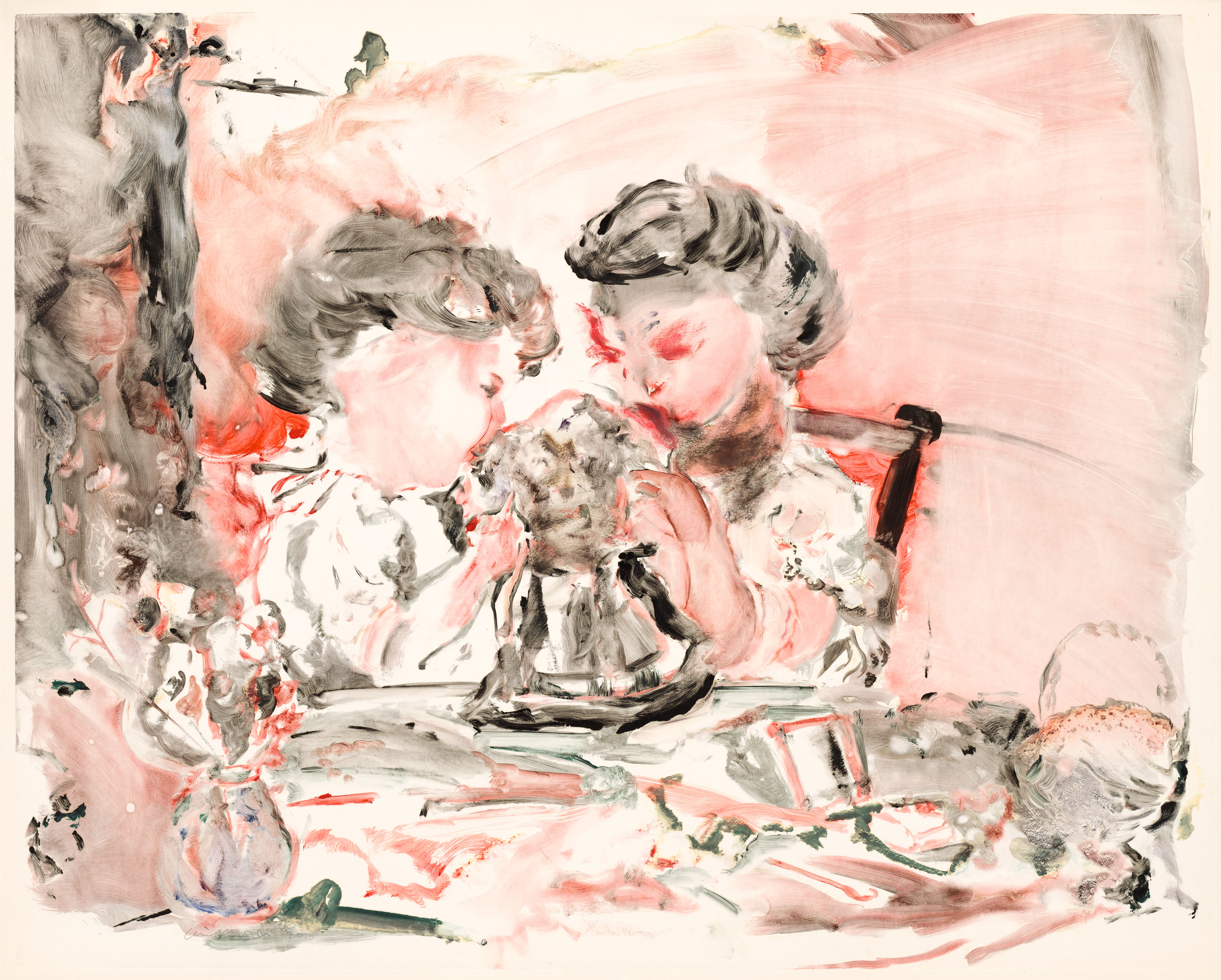 In her newly released series of monotypes, Cecily Brown references a postcard from the 1900s produced by the Italian company Alterocca. In the postcard, the dark, curly hair of two young girls forms the eye sockets of a skull, the dog they are holding between them marking the nose. Text in the postcard reads “Aujourd’hui rose, demain…” or pink today, tomorrow…, a clear reminder that no matter how youthful or plentiful your riches, death is always knocking at the door.